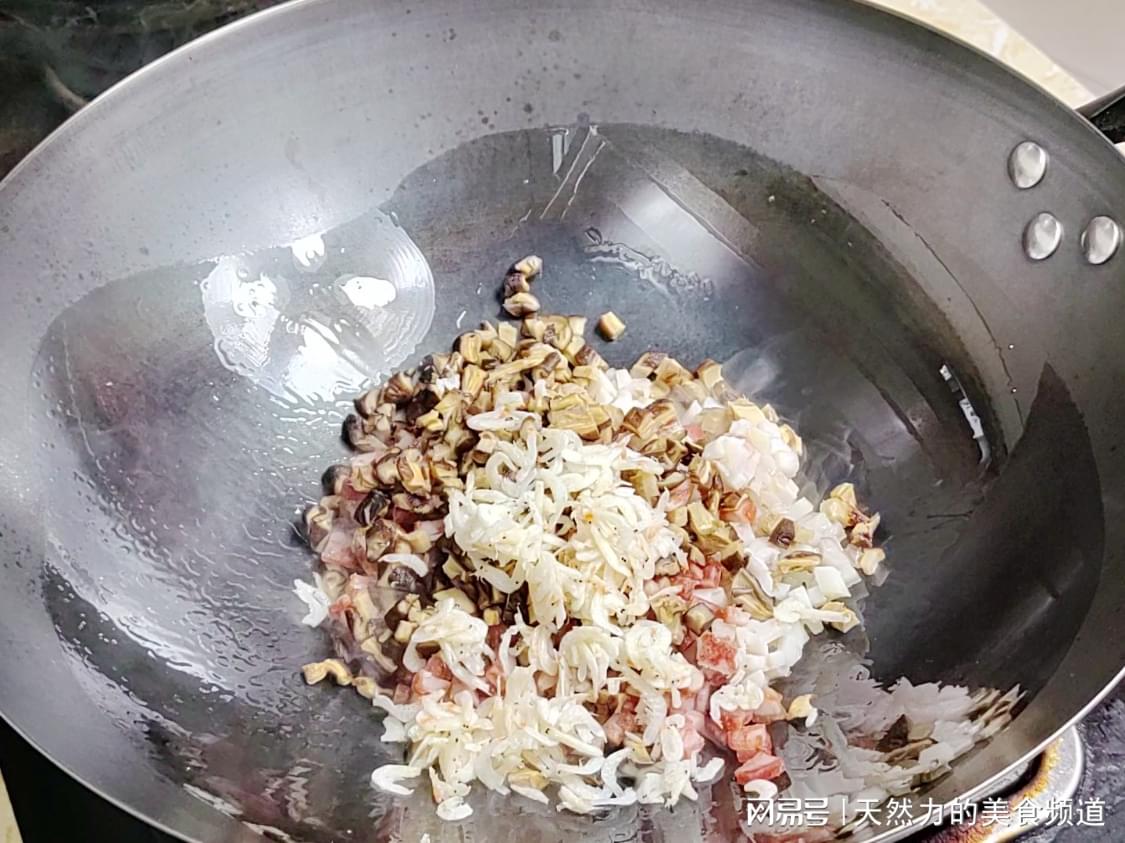 3、用少量的油把腊肉、腊肠、香菇和海米用小火煸炒出香味。香味出来后就把所有的白萝卜倒进锅内,接着把所有的调味料全部倒锅内,开大火把白萝卜炒软,炒熟。